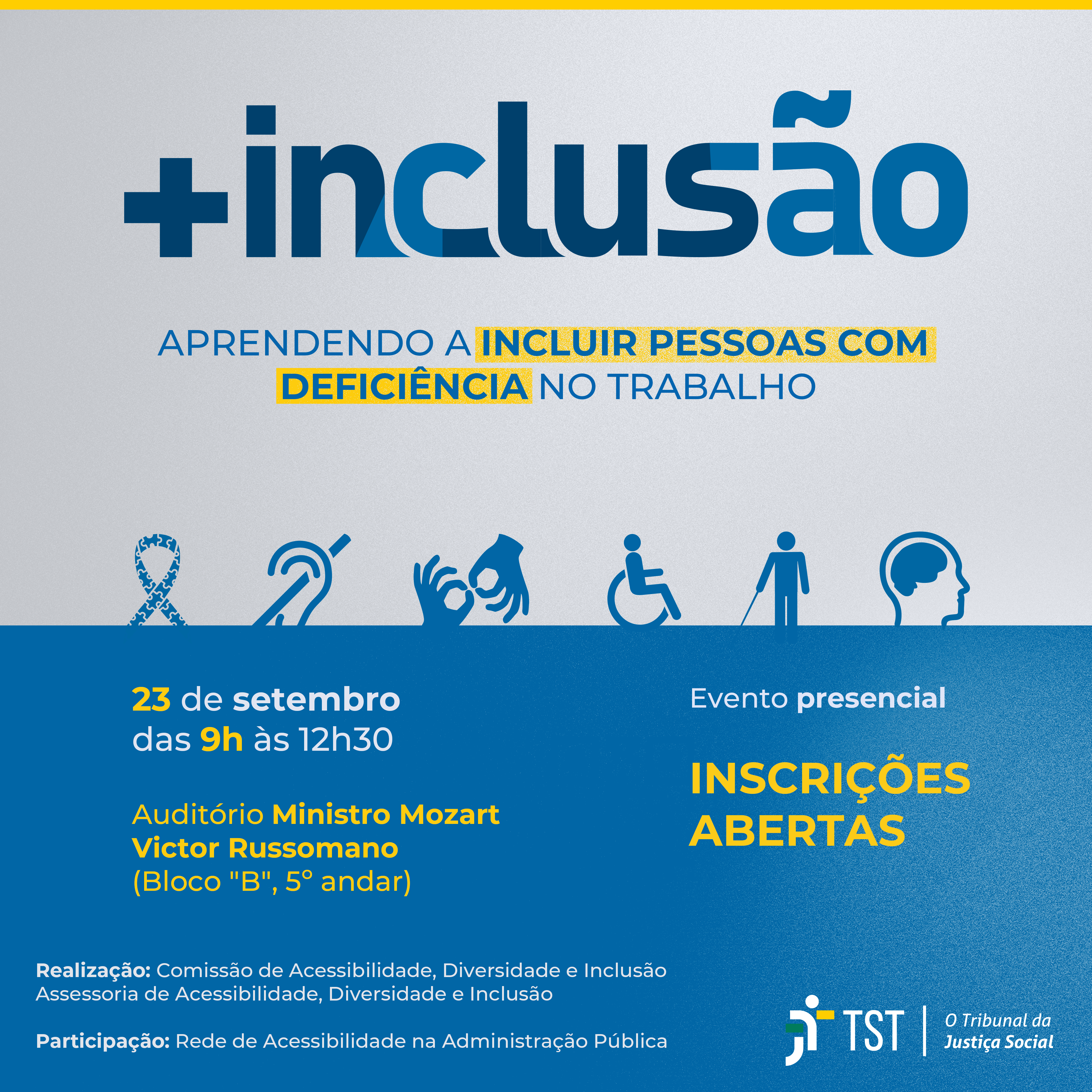 A premiação ocorre no encerramento do evento “+Inclusão: aprendendo a incluir pessoas com deficiência no trabalho”, realizado para marcar o Dia da Luta da Pessoa com Deficiência. O evento, que será no dia 23/9, das 9h às 12h30, na sede do Tribunal Superior do Trabalho (TST), em Brasília (DF), está com inscrições abertas.