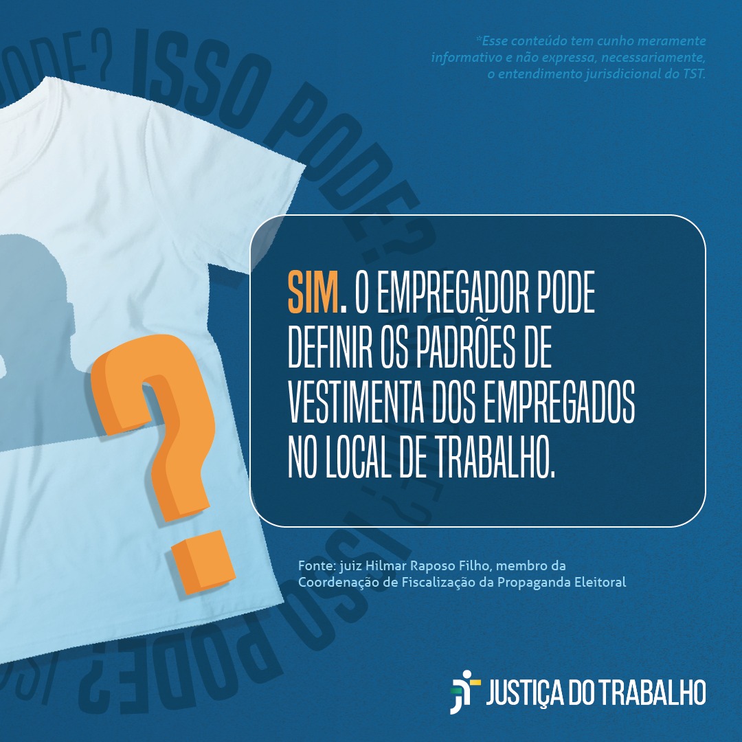 Post das redes sociais do TST com a pergunta: A empresa pode proibir que seus empregados usem camisetas de empregados no ambiente de trabalho?