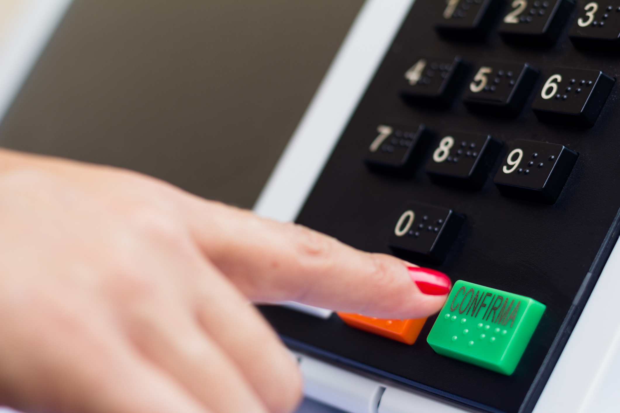 Pessoa apertando a tecla confirma na urna eletrônica